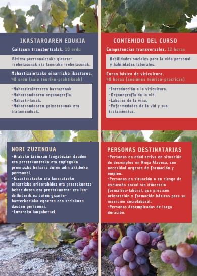 Curso básico de viticultura, que vamos a llevar a cabo del 27 de junio al 24 de Julio en Oion, con horario de 10:00 a 13:00.